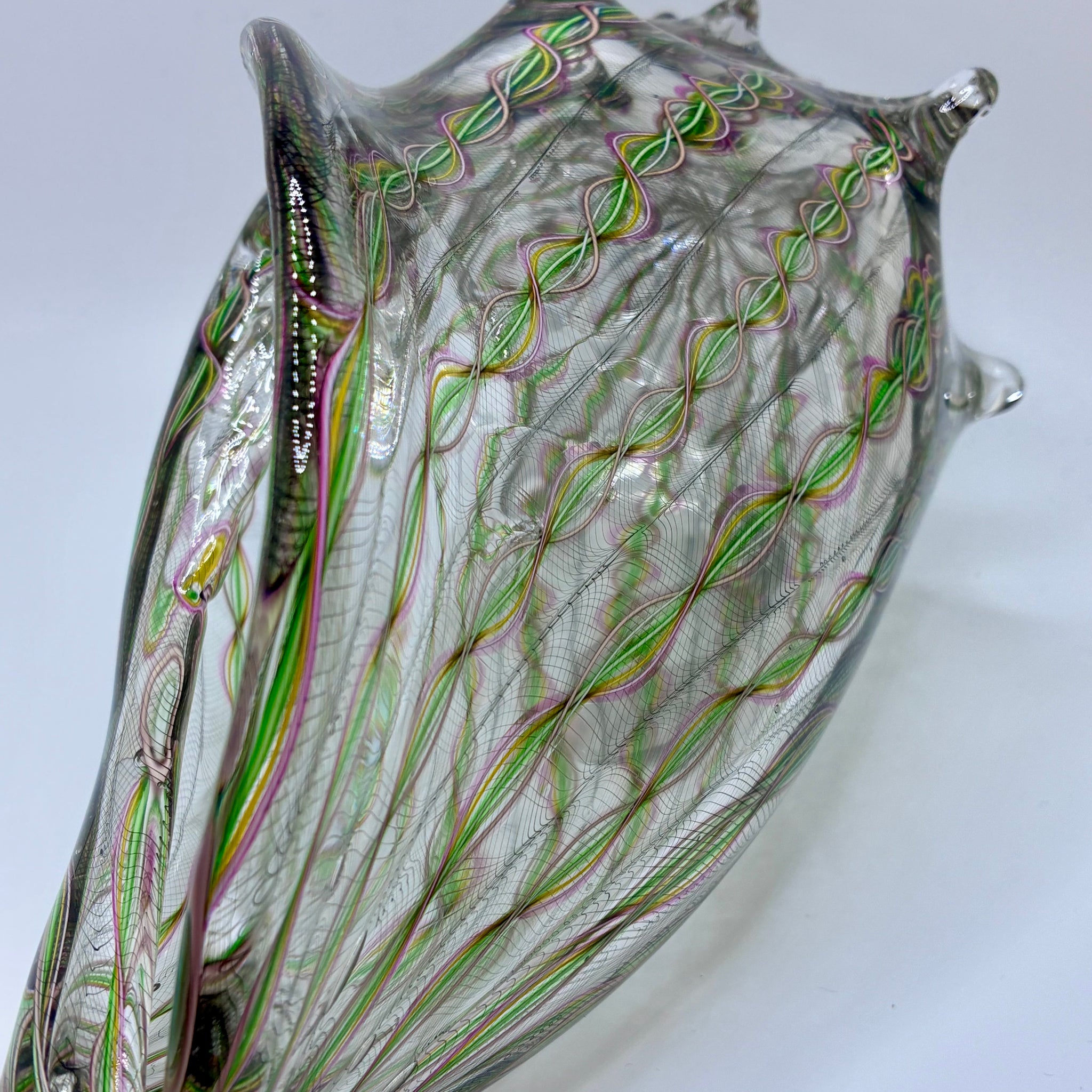 Handblown glass shell, created using masterful caning techniques. Features a green tinted glass.