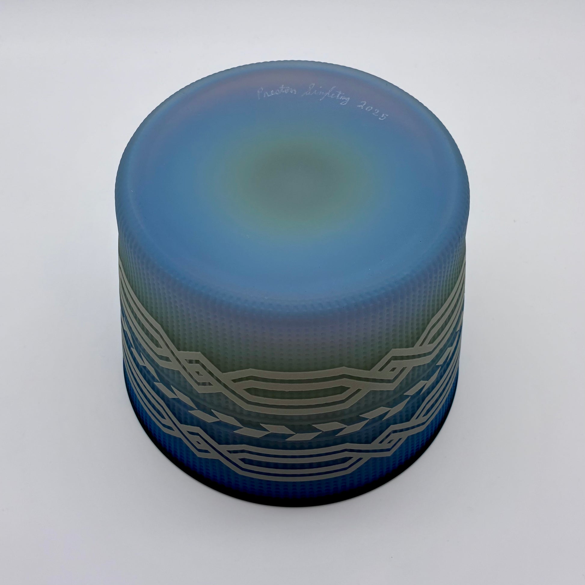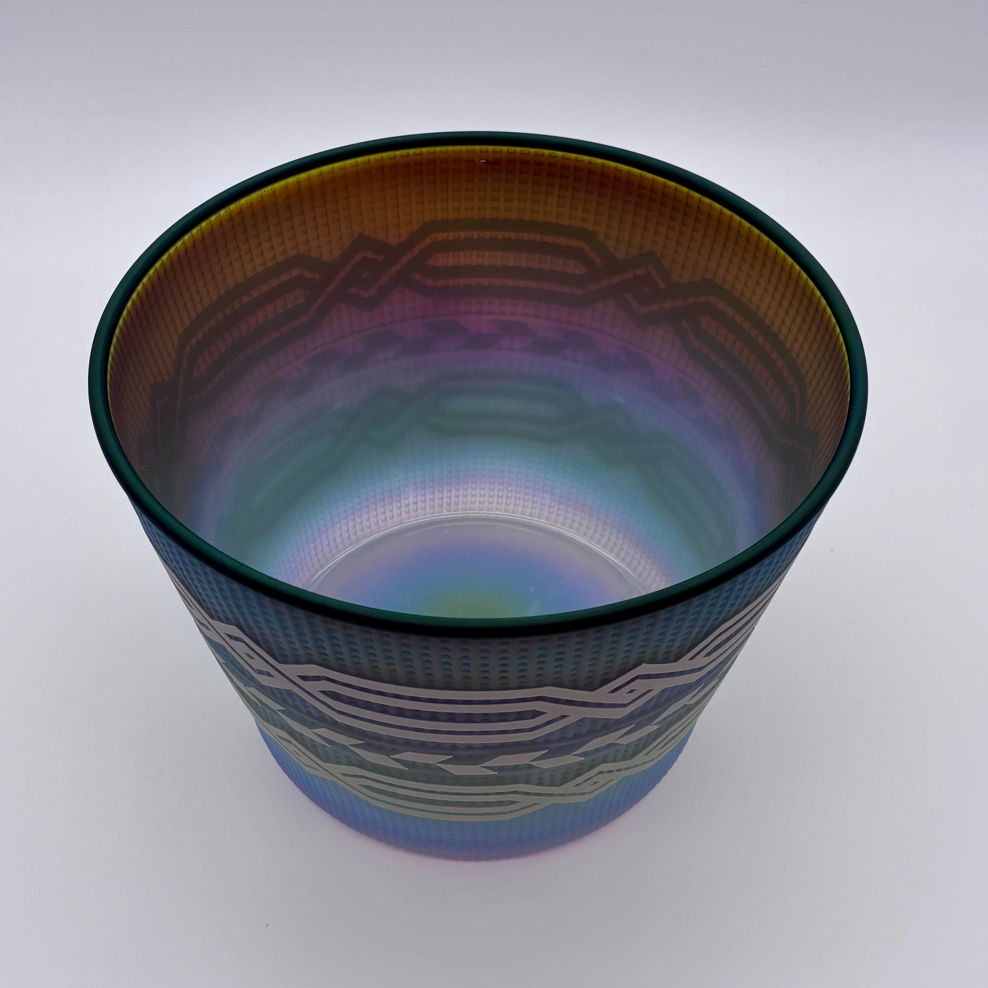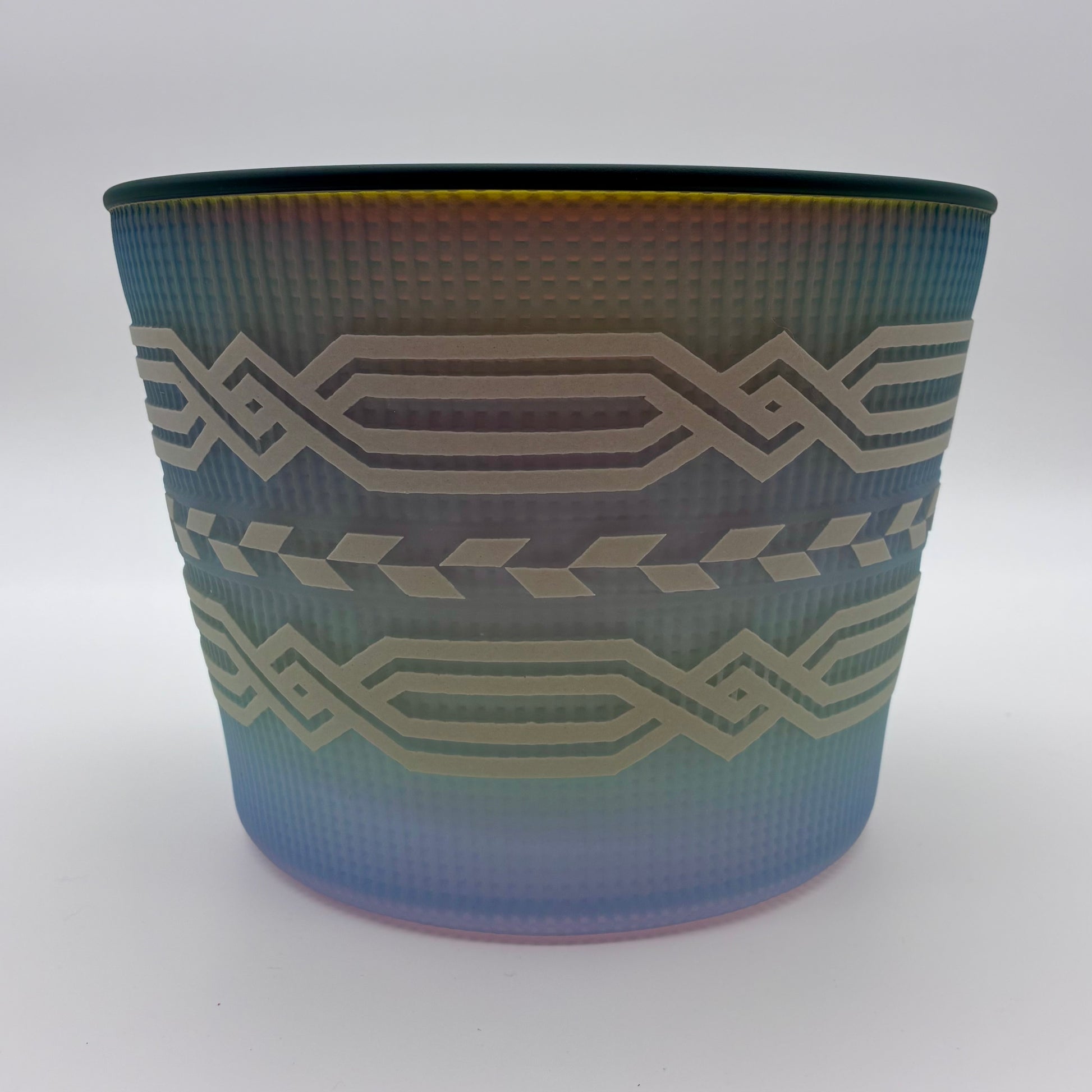 When the basket has cooled, a stencil is applied to the surface, to create the larger basket designs, and then strips of custom-made tape are applied over the stencil, first vertically, then horizontally in a spiral in order to create the basket weave design. The whole surface is deeply sandblasted (called sand-carving) once, then the spiral of tape is removed, then it is sandblasted a second time, and finally, the vertical lines of tape are removed.