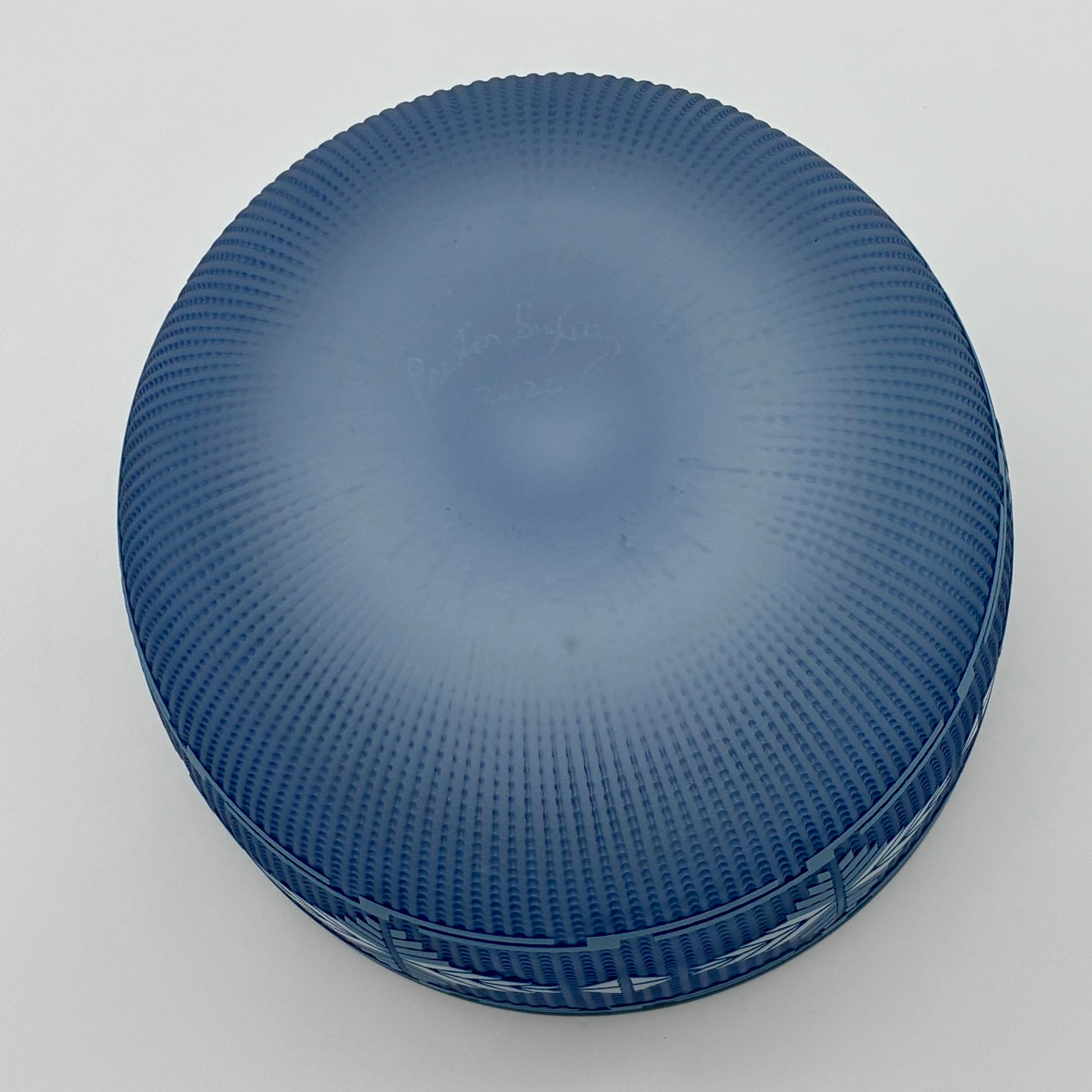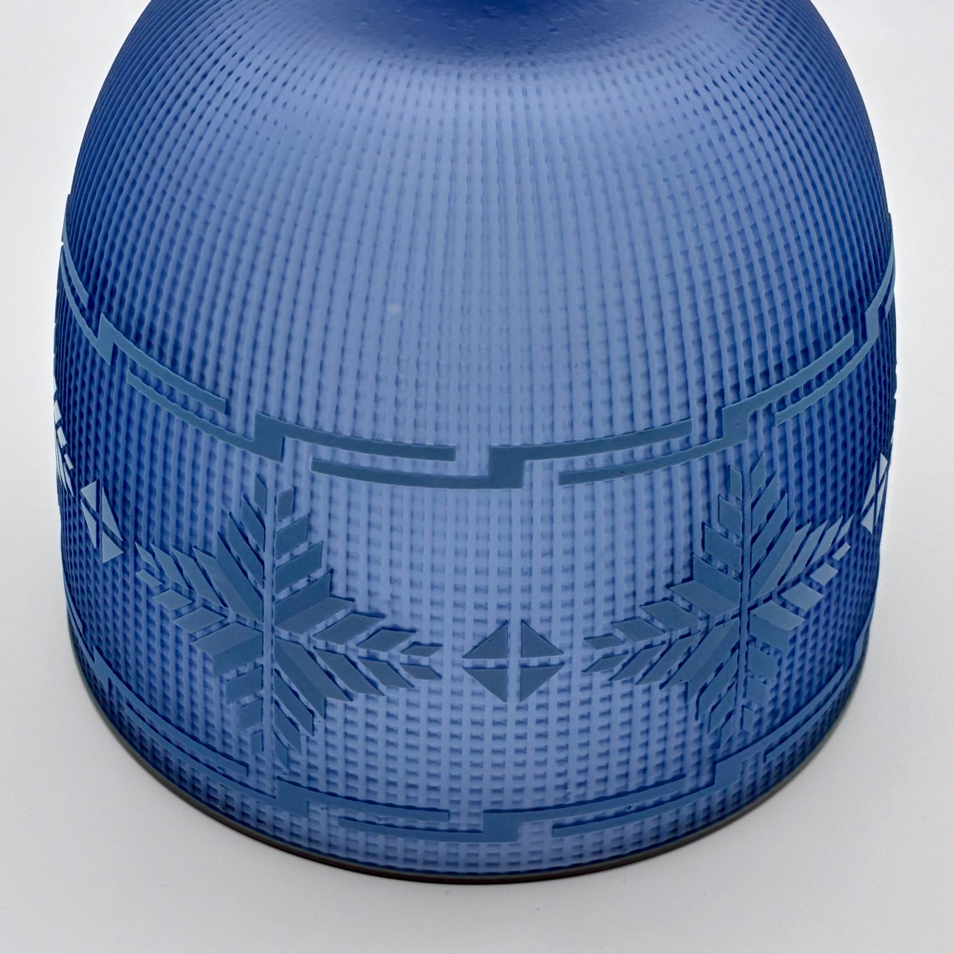 When the basket has cooled, a stencil is applied to the surface, to create the larger basket designs, and then strips of custom-made tape are applied over the stencil, first vertically, then horizontally in a spiral in order to create the basket weave design. The whole surface is deeply sandblasted (called sand-carving) once, then the spiral of tape is removed, then it is sandblasted a second time, and finally, the vertical lines of tape are removed.