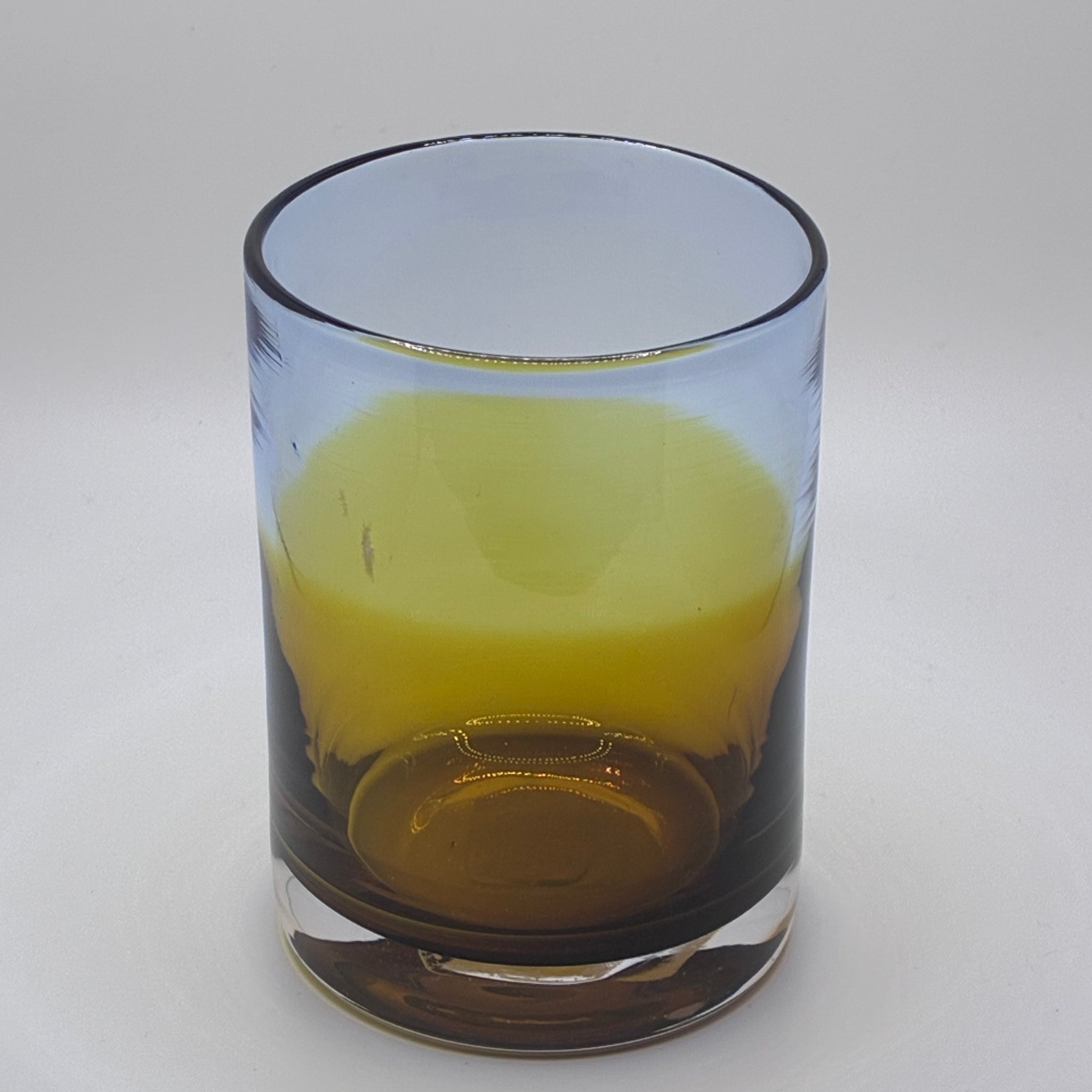 Handblown glass drinking vessel featuring masterful use of unique glass types that blur between amber, to green and blue.