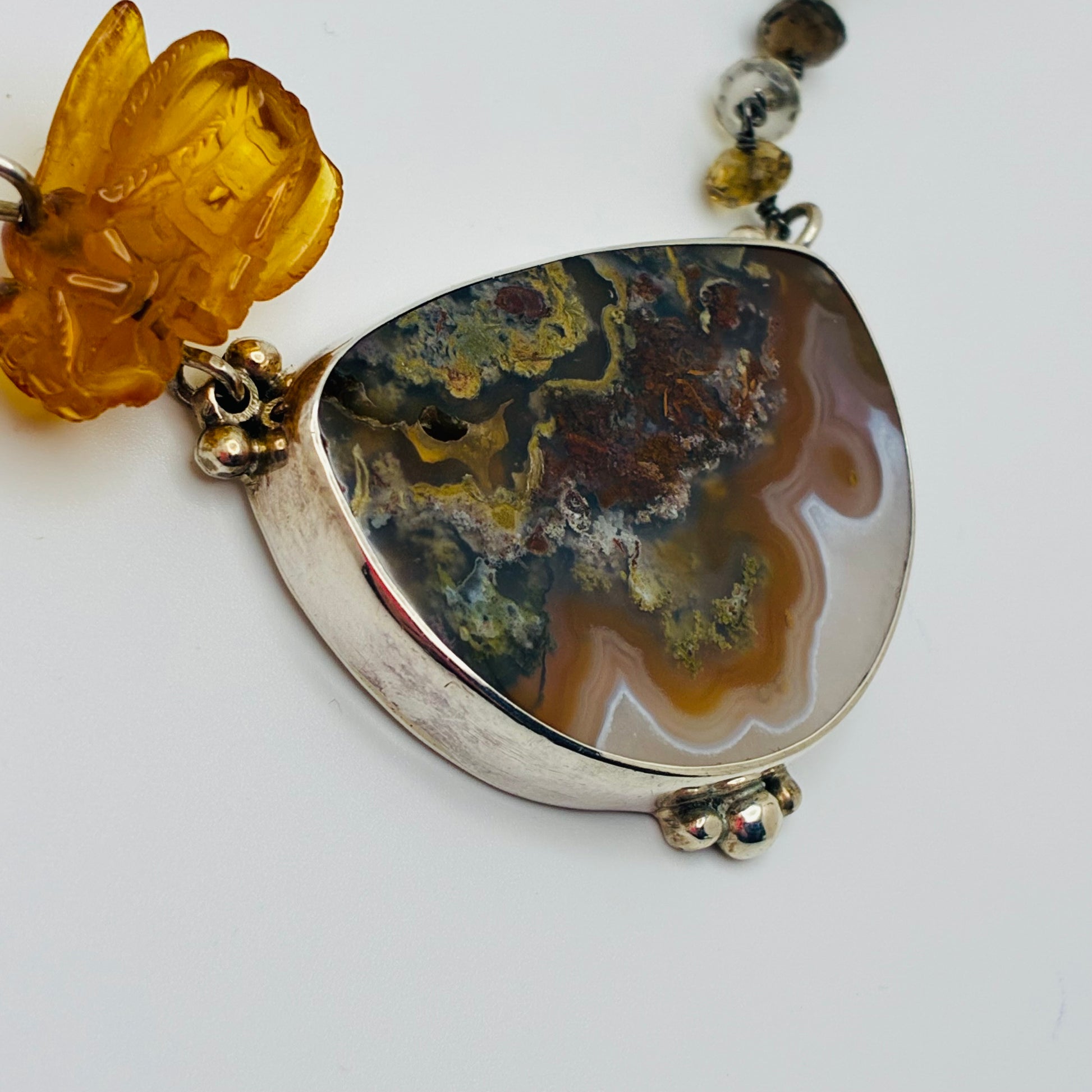 Amber Bee necklace hand carved in Bali. Please note a few small holes in the stone surface. These are part of the agate's natural beauty.