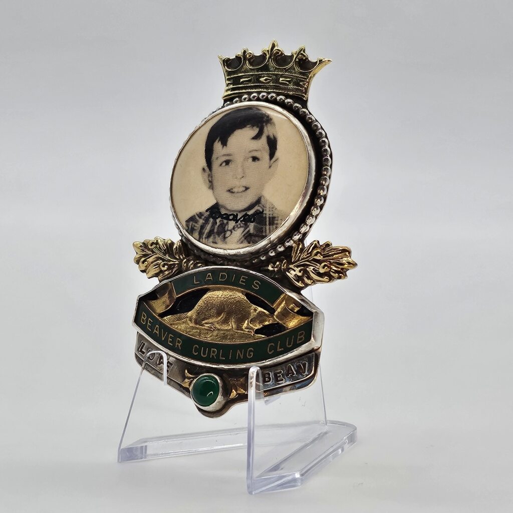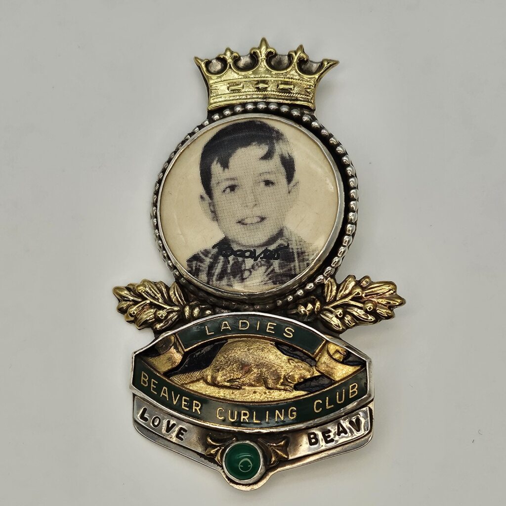 1957 to 1963 Beaver fan button, Women's Curling Club and green onyx pin.