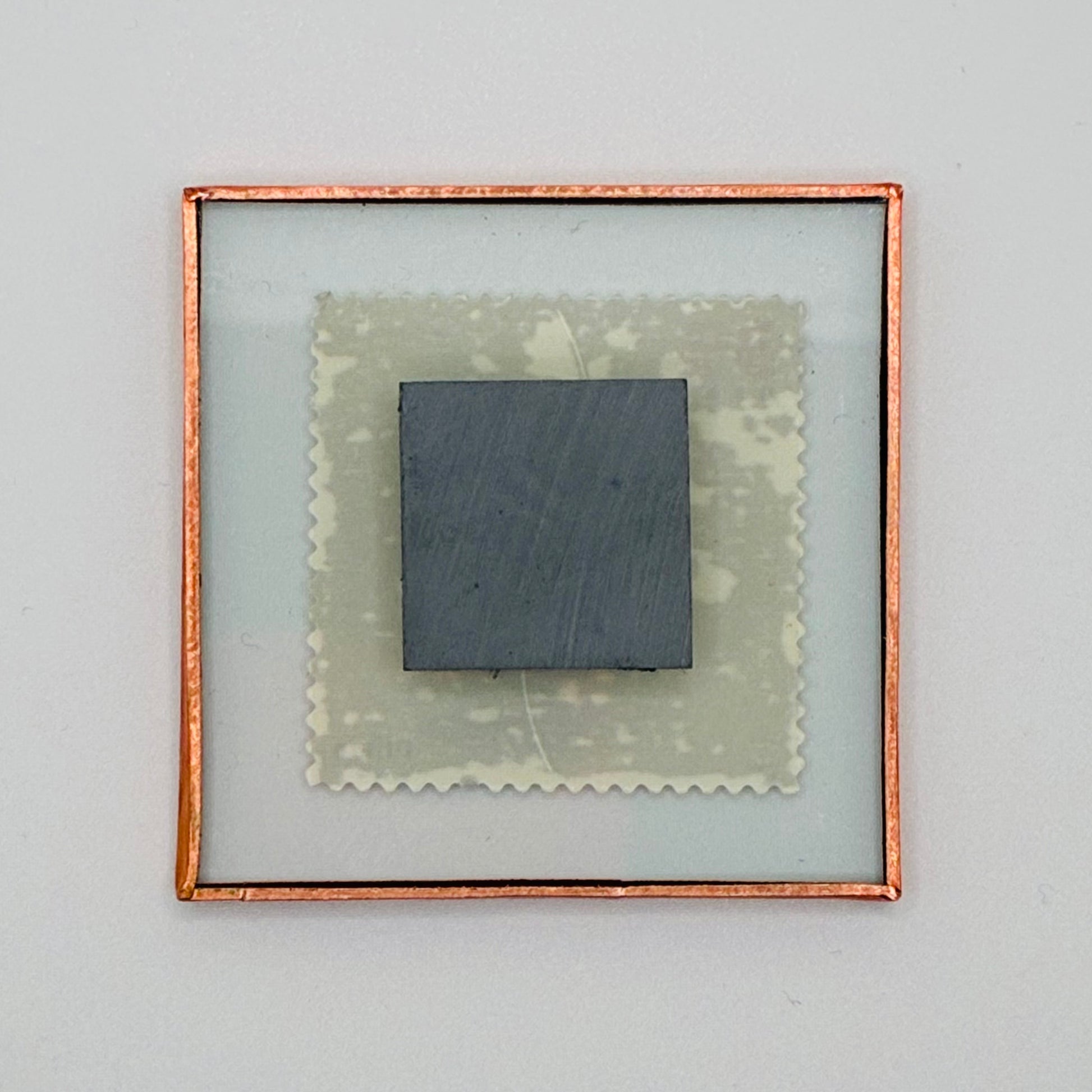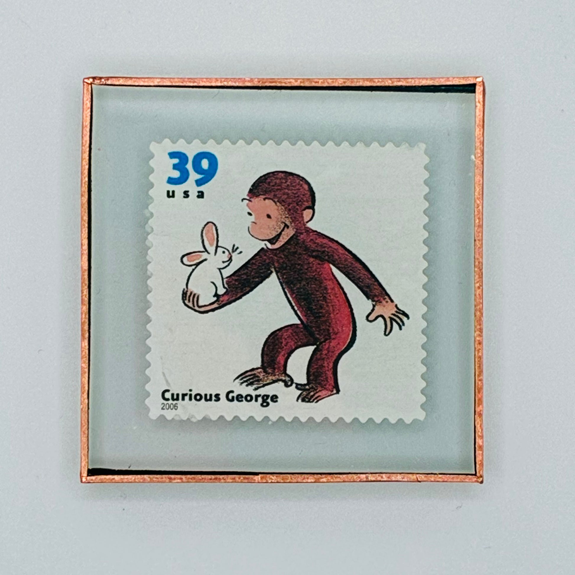 Curious George postage stamp encased in glass wrapped in copper foil mounted on a magnet.