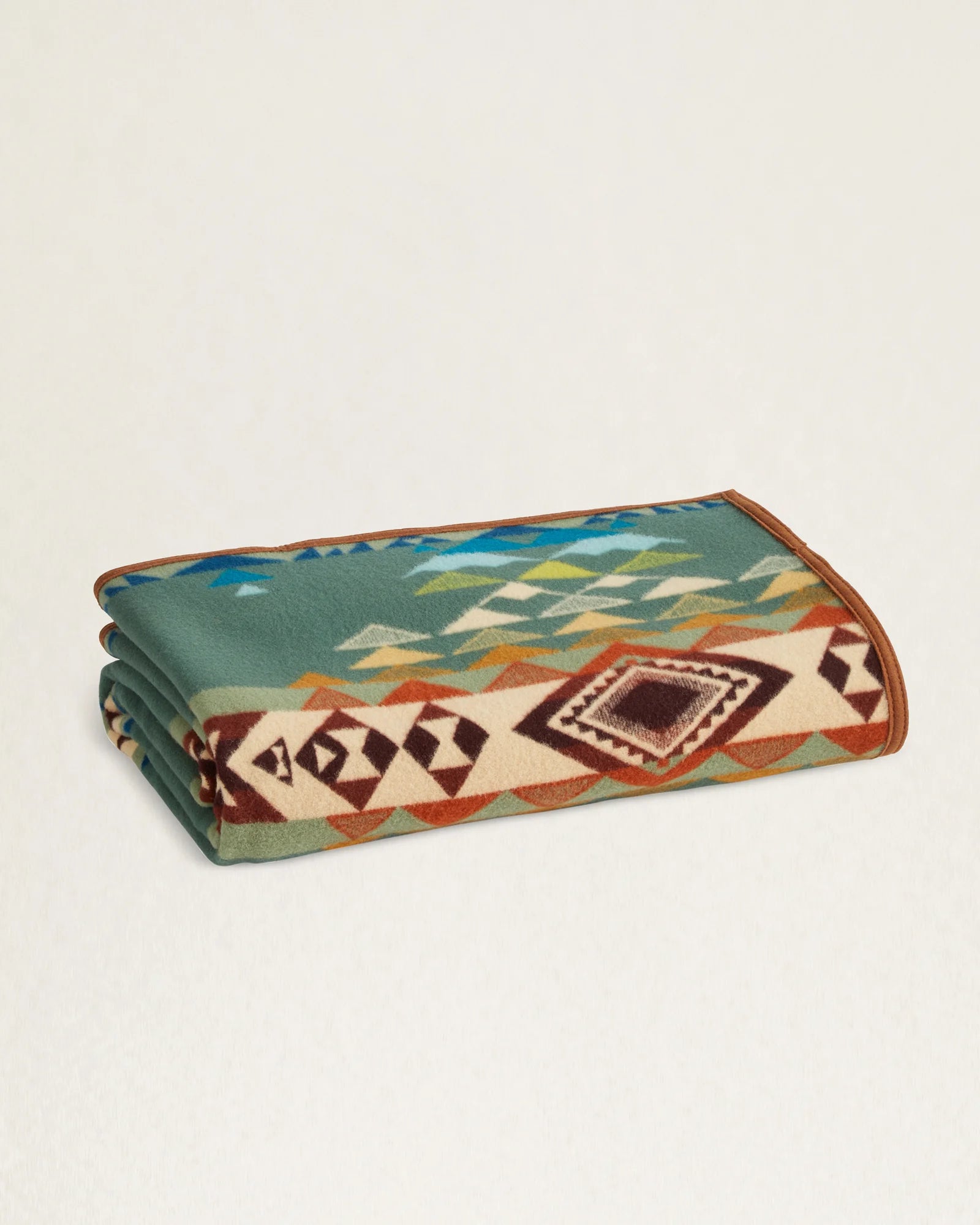 The Sierra Nevada range is the longest continuous and unified mountain chain in the United States. In this blanket design, interlocking groups of triangles arranged in unbroken bands celebrate the storied range and one of its tallest mountains, Highland Peak. Made start to finish in the Pacific Northwest, this wool blanket is expertly woven on three-story jacquard looms. It reverses for two distinct looks.