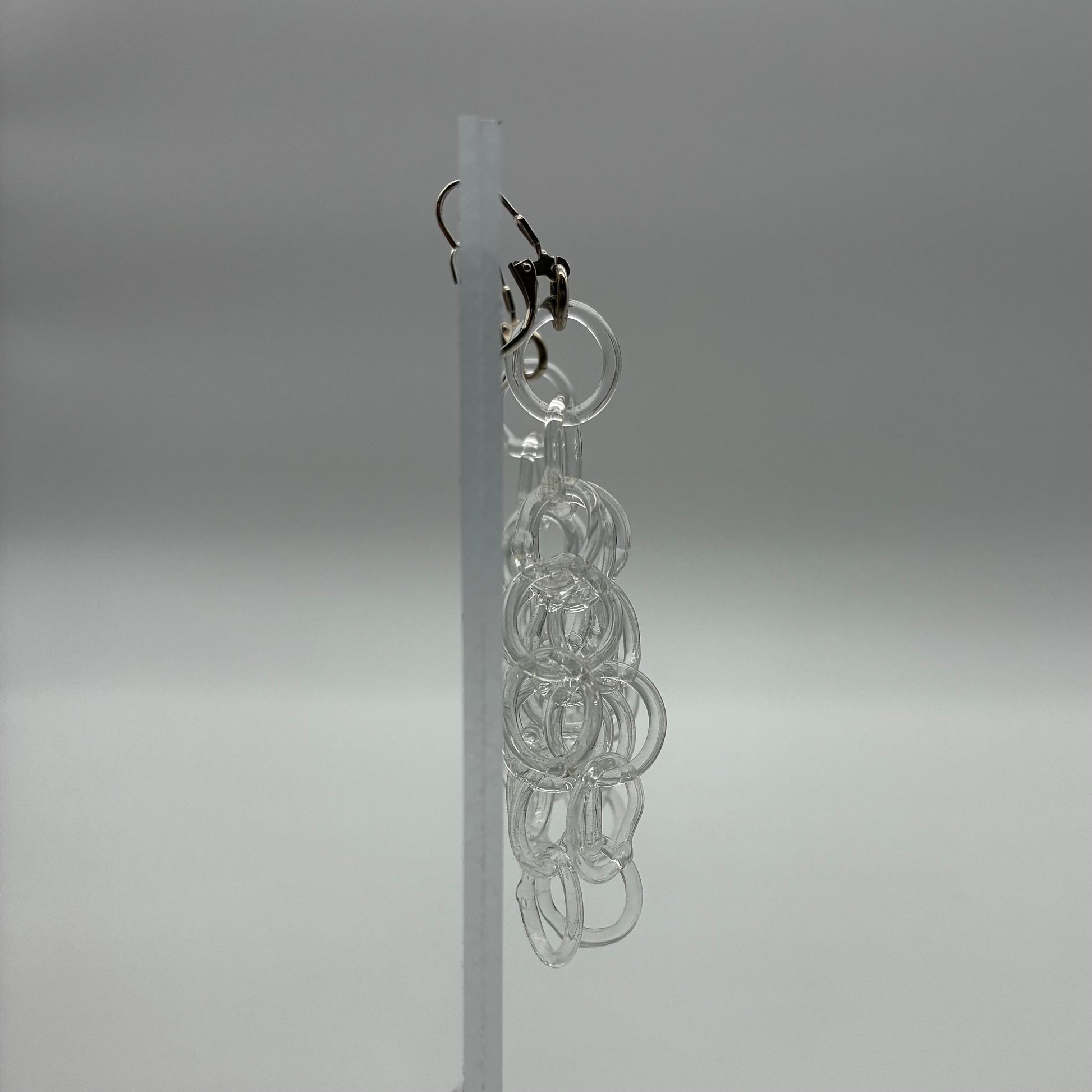 Inna Peck: handmade borosilicate glass tassel drop earrings. Tassels are composed of dainty clear borosilicate glass loops.