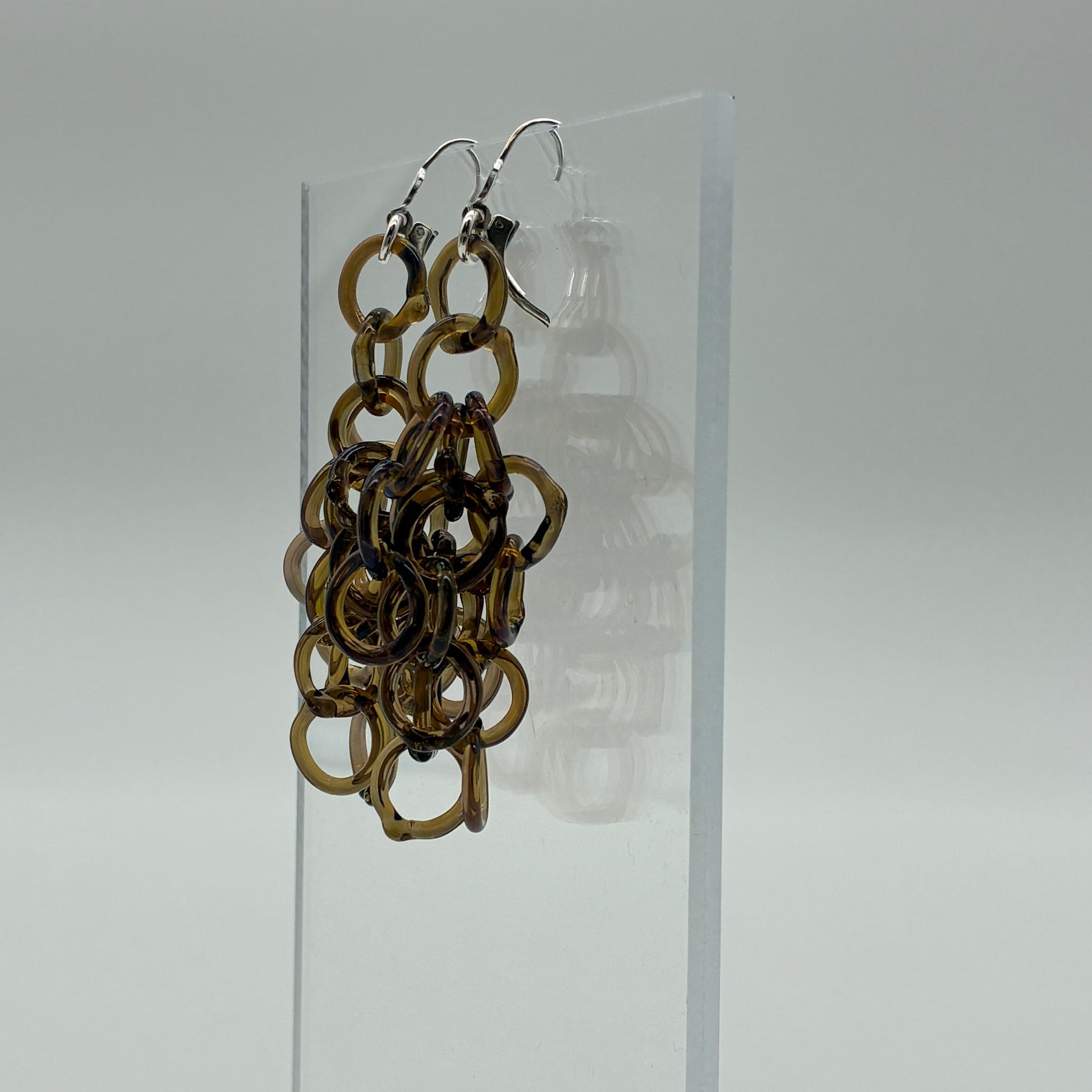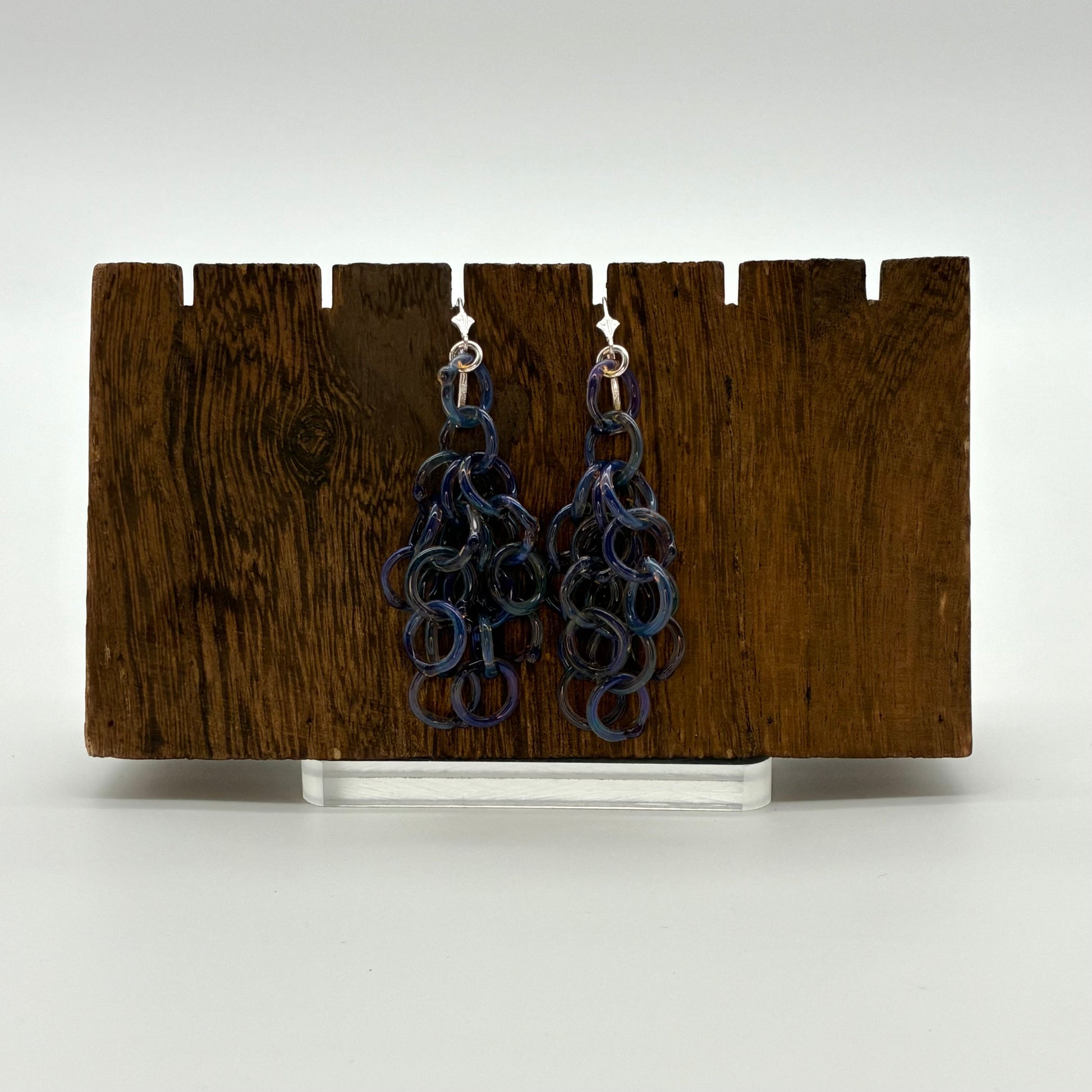 Inna Peck: handmade borosilicate glass tassel drop earrings. Tassels are composed of dainty borosilicate glass loops with a purple/blue iridescent effect that changes depending of the light and background.