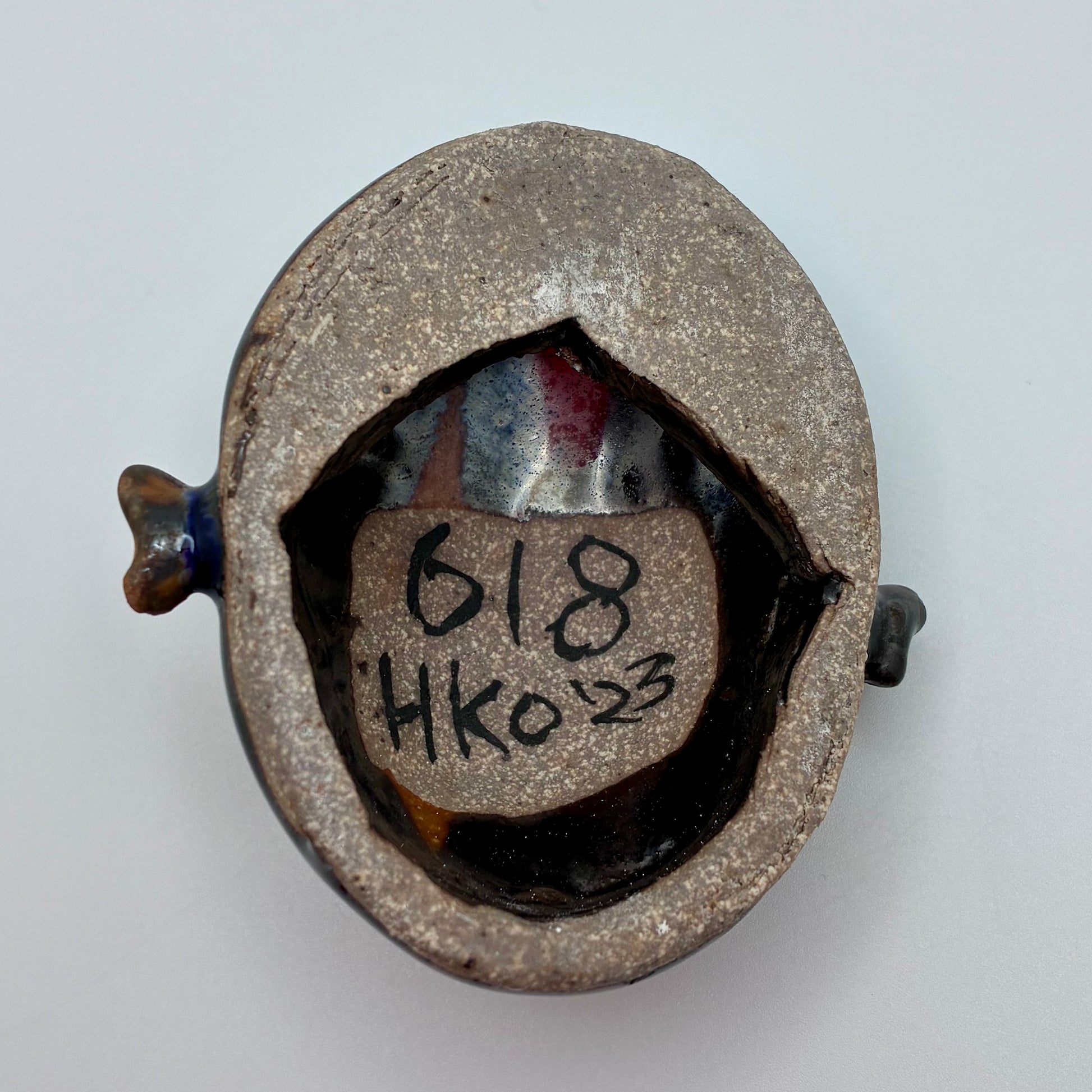 Hand constructed ceramic masks by Hanako O'leary for wall hanging.