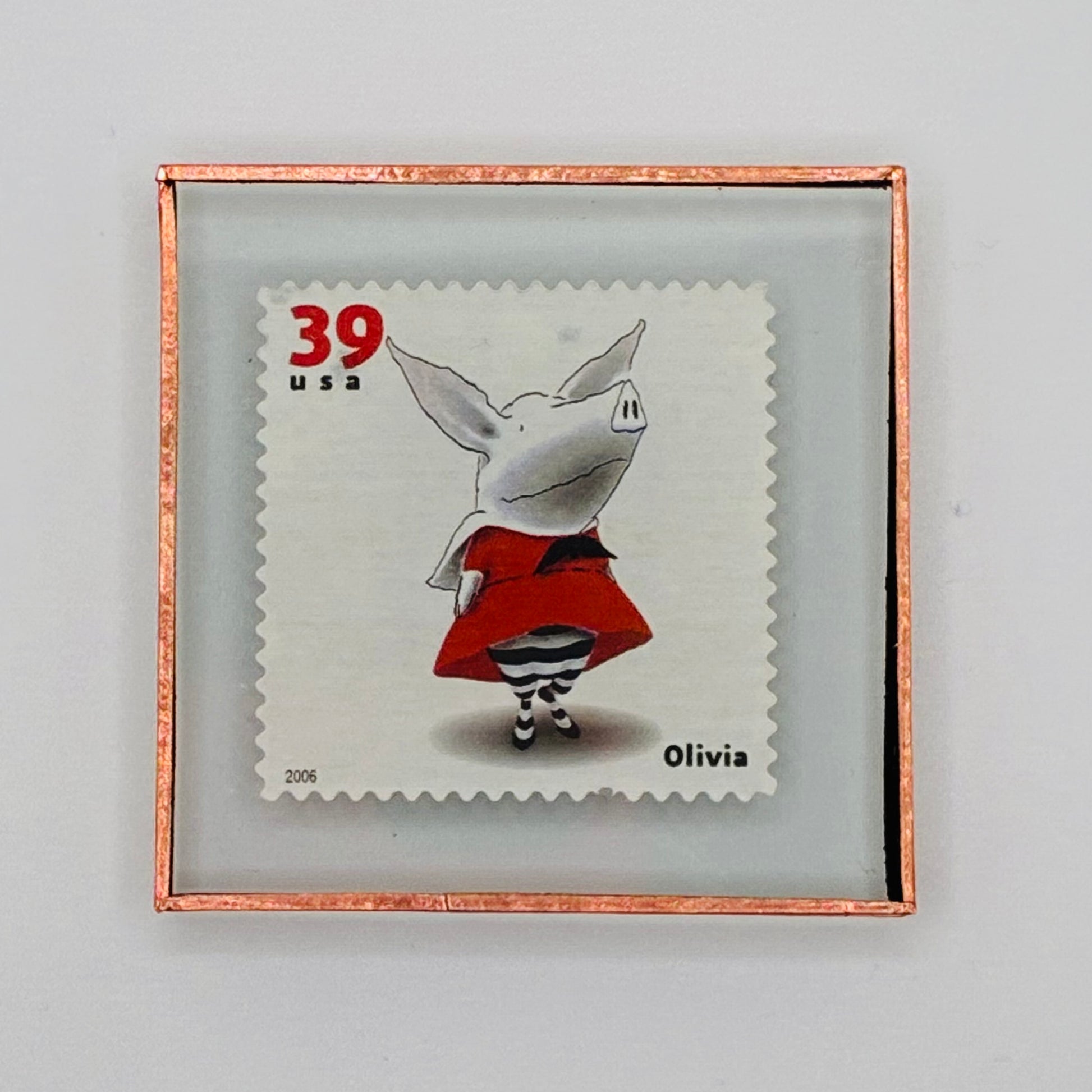 Olivia postage stamp encased in glass wrapped in copper foil mounted on a magnet.