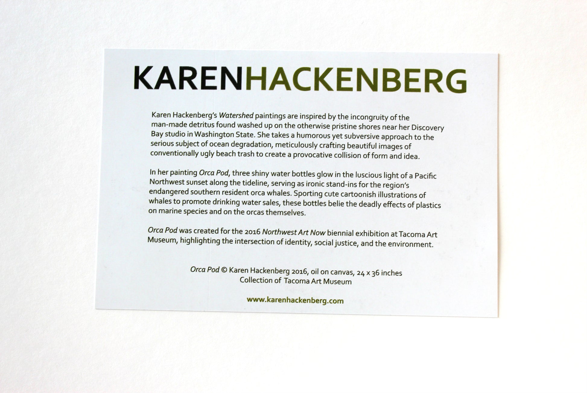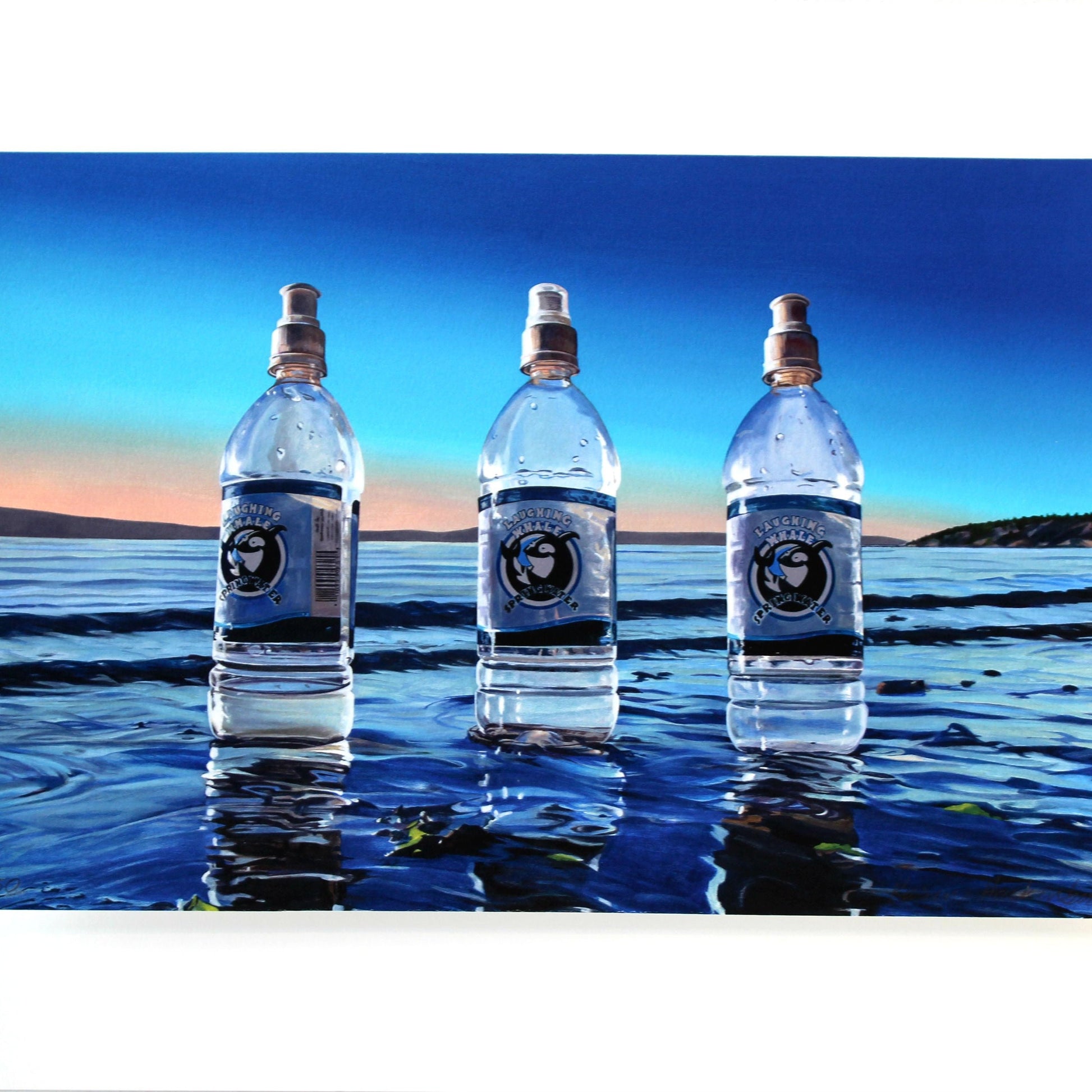In her painting Orca Pod, three shiny water bottles glow in the luscious light of a Pacific Northwest sunset along the tideline, serving as ironic stand-ins for the region’s endangered southern resident orca whales. Sporting cute cartoonish illustrations of whale to promote drinking water sales, these bottles belie the deadly effects of plastics on marine species and on the orcas themselves.