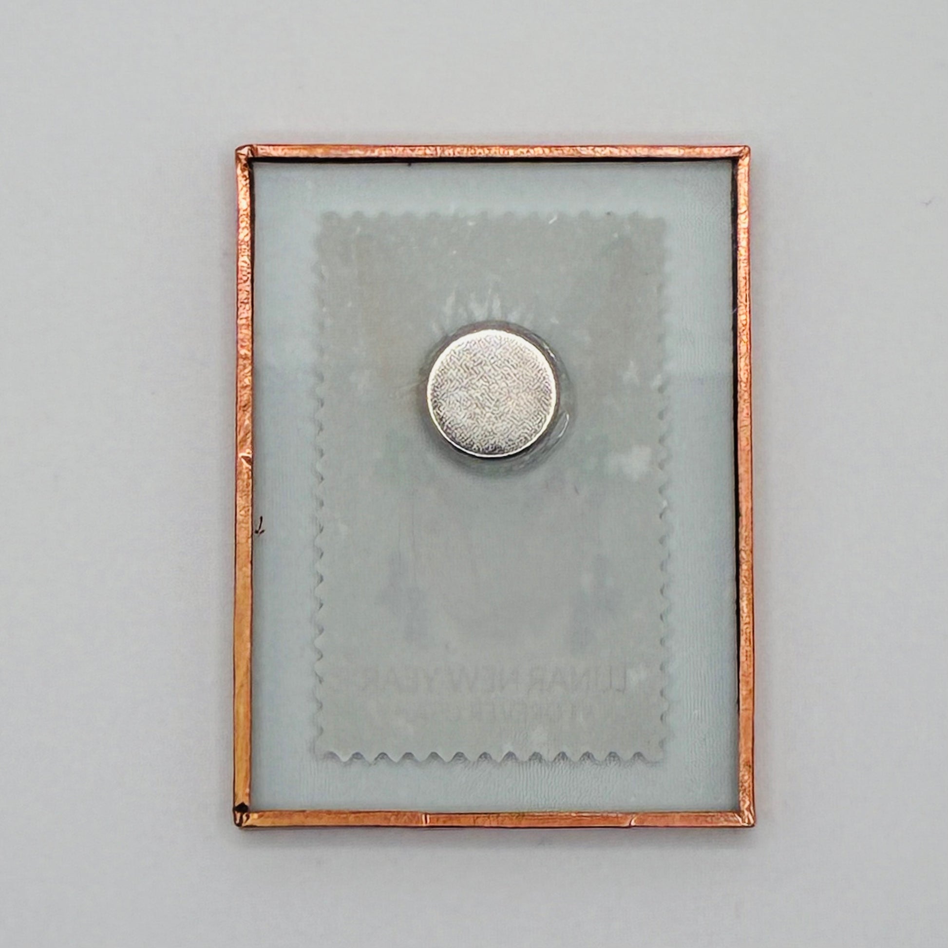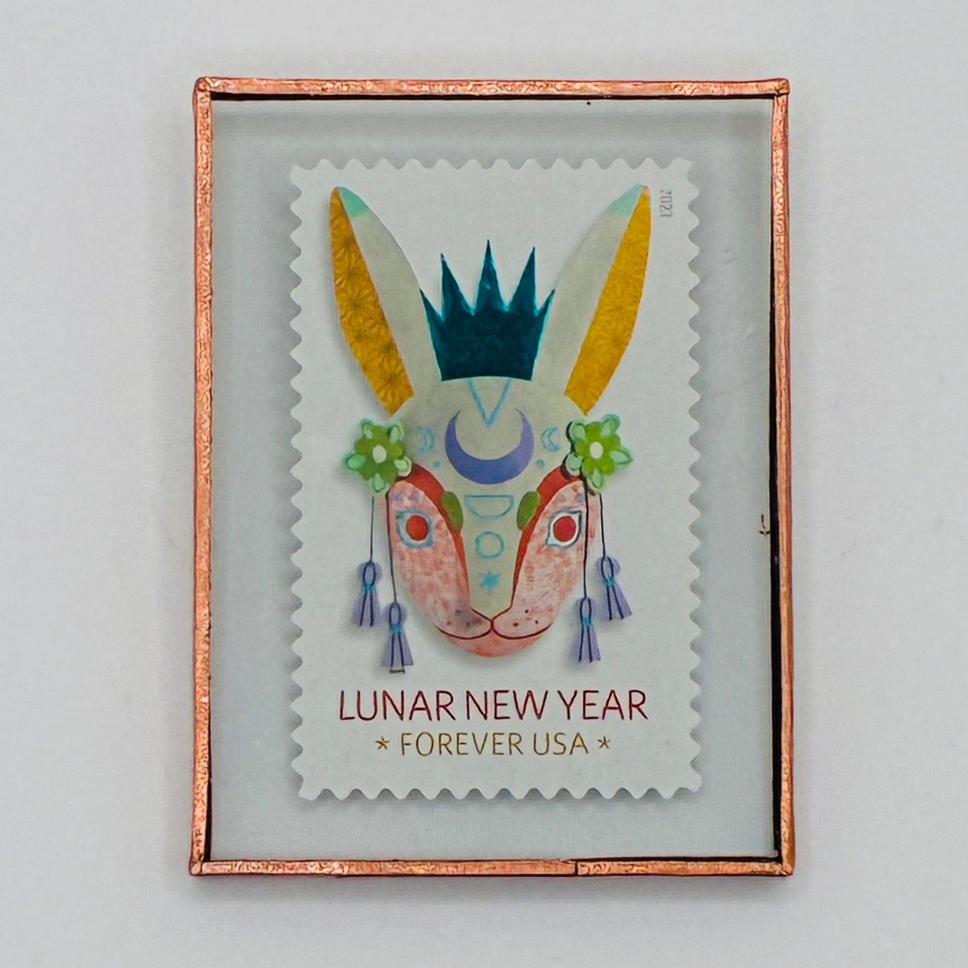 Rabbit Lunar New Year postage stamp encased in glass wrapped in copper foil mounted on a magnet.