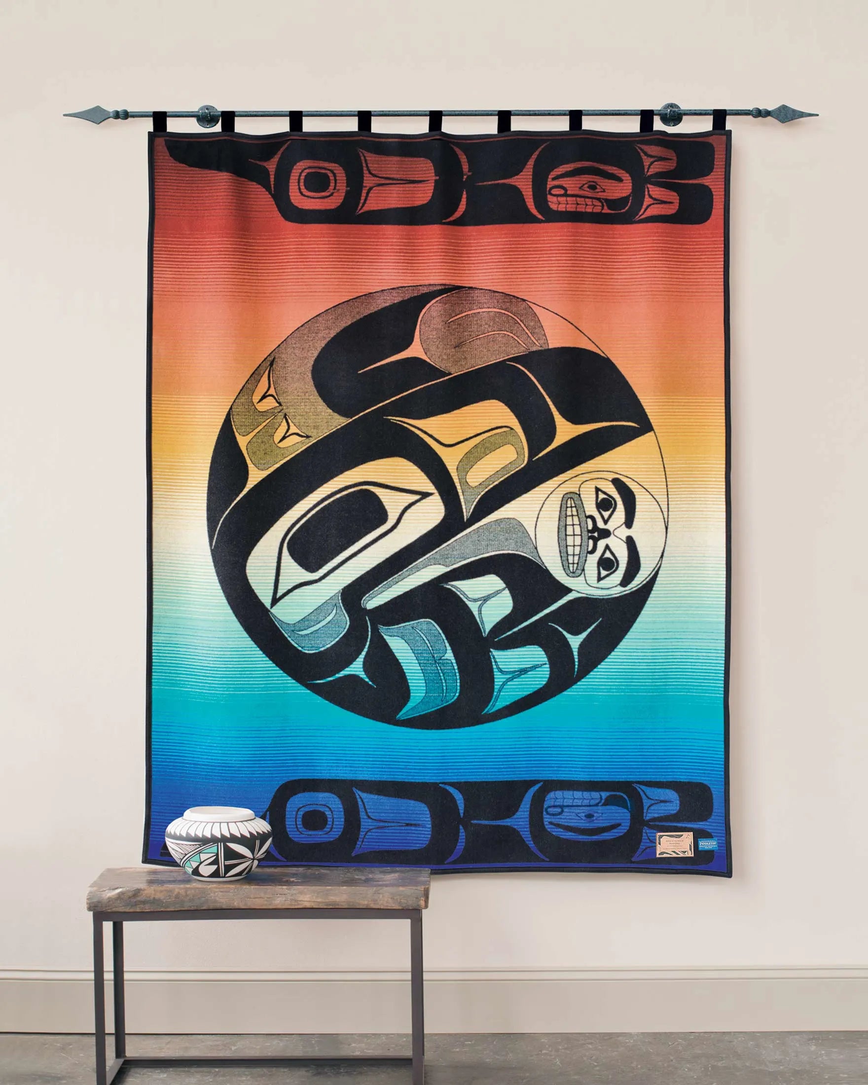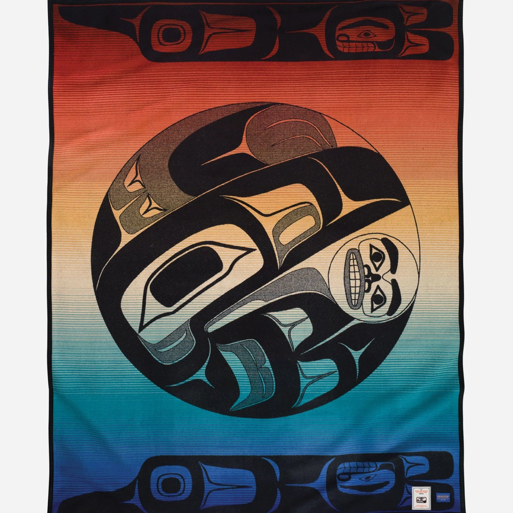 A blanket with a story to tell, based on a work by artist Preston Singletary. The image represents Raven, a shape shifter and trickster. In the story, the old chief who lived at the head of the Nass River kept his precious treasures—the sun, the moon and the stars—in beautifully carved boxes. Raven steals the boxes and makes his escape into the night sky, carrying the sun in his mouth. The sun is a metaphor for enlightenment or knowledge. The ombred background shades meet at the center in vibrant colors of sun and light.