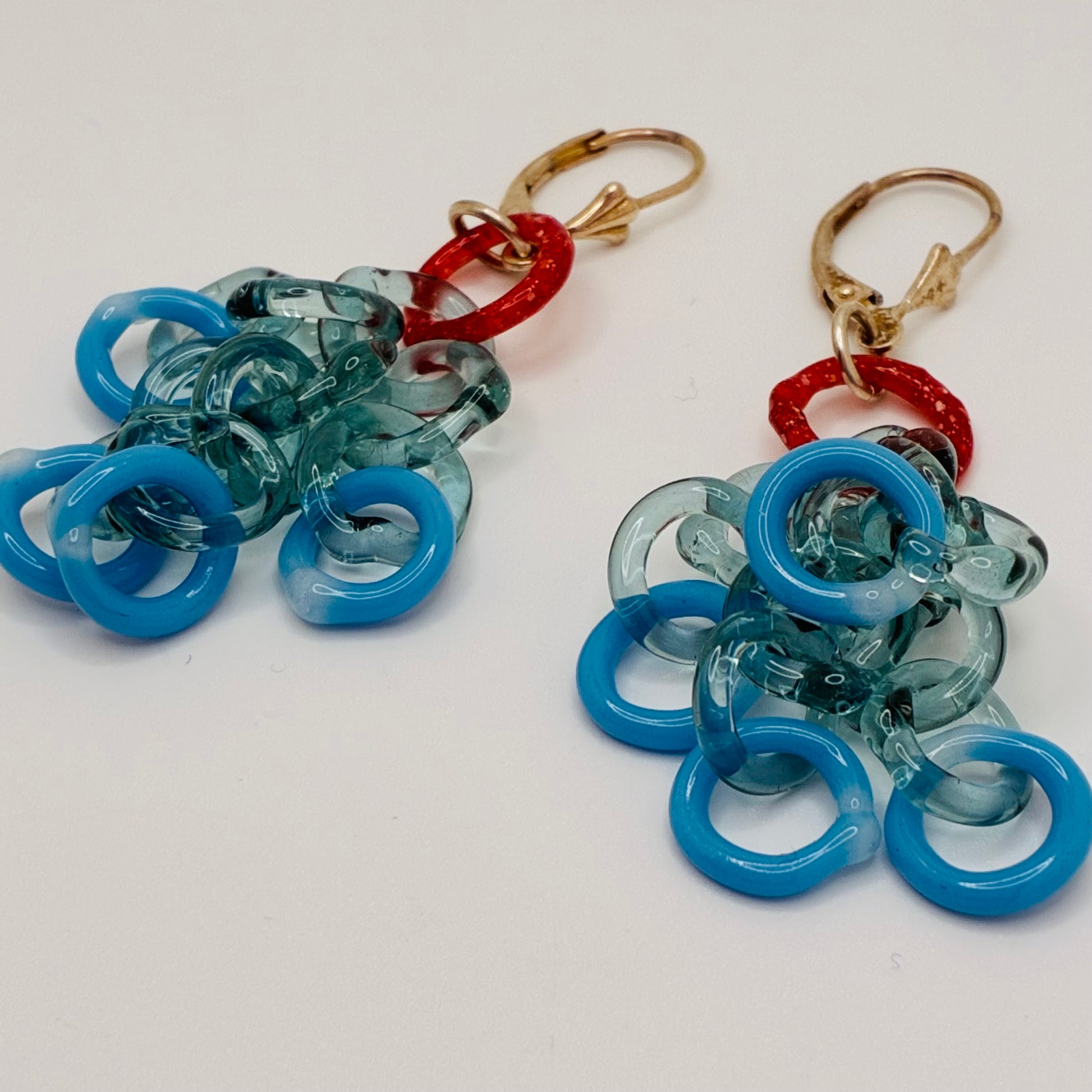 Inna Peck: handmade borosilicate glass tassel drop earrings. Tassels are composed of dainty ocean blue and confetti orange colored borosilicate glass loops.