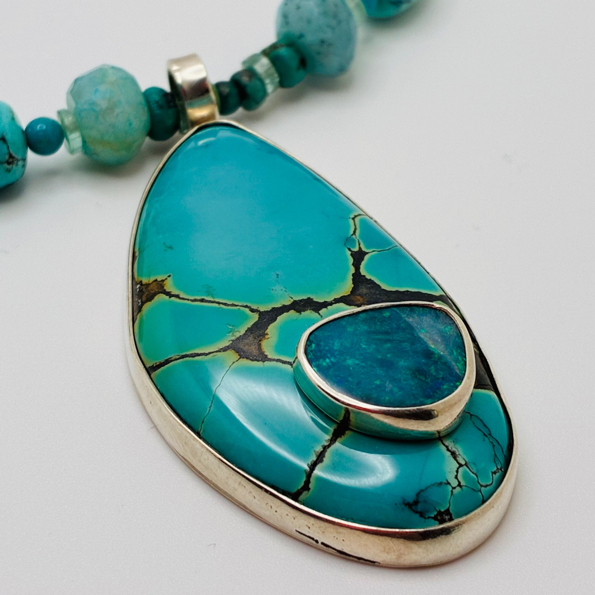Turquoise + Australian Opal necklace. Includes ancient Roman glass, and Applelite crystal. Chain is 20". Medallion approximately 2.25" long.